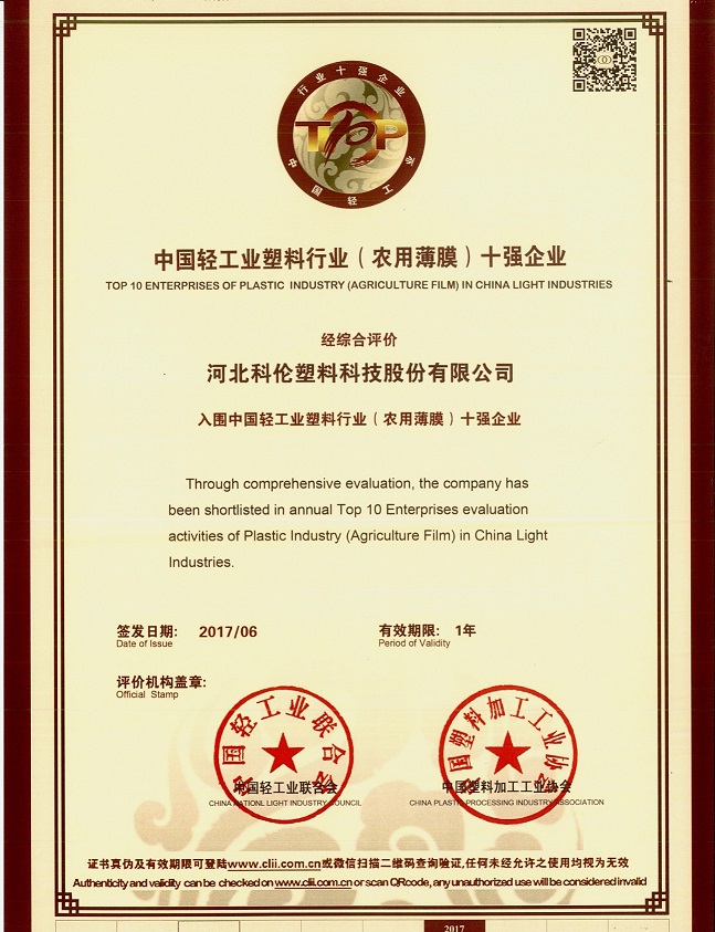 日前,經(jīng)過中國輕工業(yè)聯(lián)合會和中國塑料加工工業(yè)協(xié)會聯(lián)合層層評選,科倫股份被評為“中國輕工業(yè)塑料行業(yè)(農(nóng)用薄膜)十強(qiáng)企業(yè)”,彰顯了科倫股份在引領(lǐng)行業(yè)發(fā)展方面做出的貢獻(xiàn)。